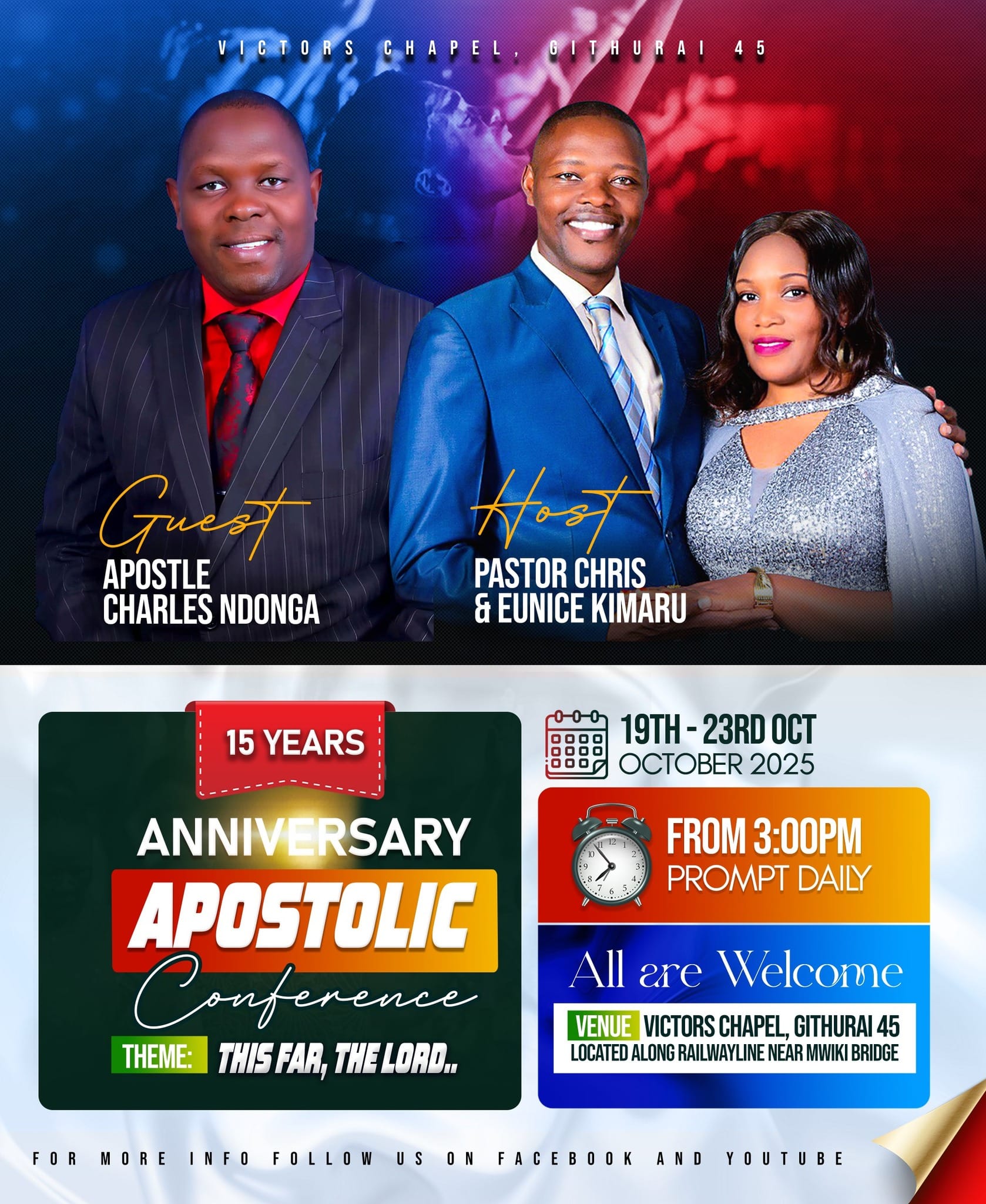 You are warmly invited to join us as we celebrate 15 Years Anniversary of Victors Chapel Githurai 45 during a powerful Apostolic Conference under the theme “This Far, the Lord.” This will be a special time of thanksgiving, spiritual impartation, and reflection on God’s faithfulness as we gather in worship, prayer, and the teaching of God’s Word. We would truly be glad to fellowship with you as we celebrate this milestone together.