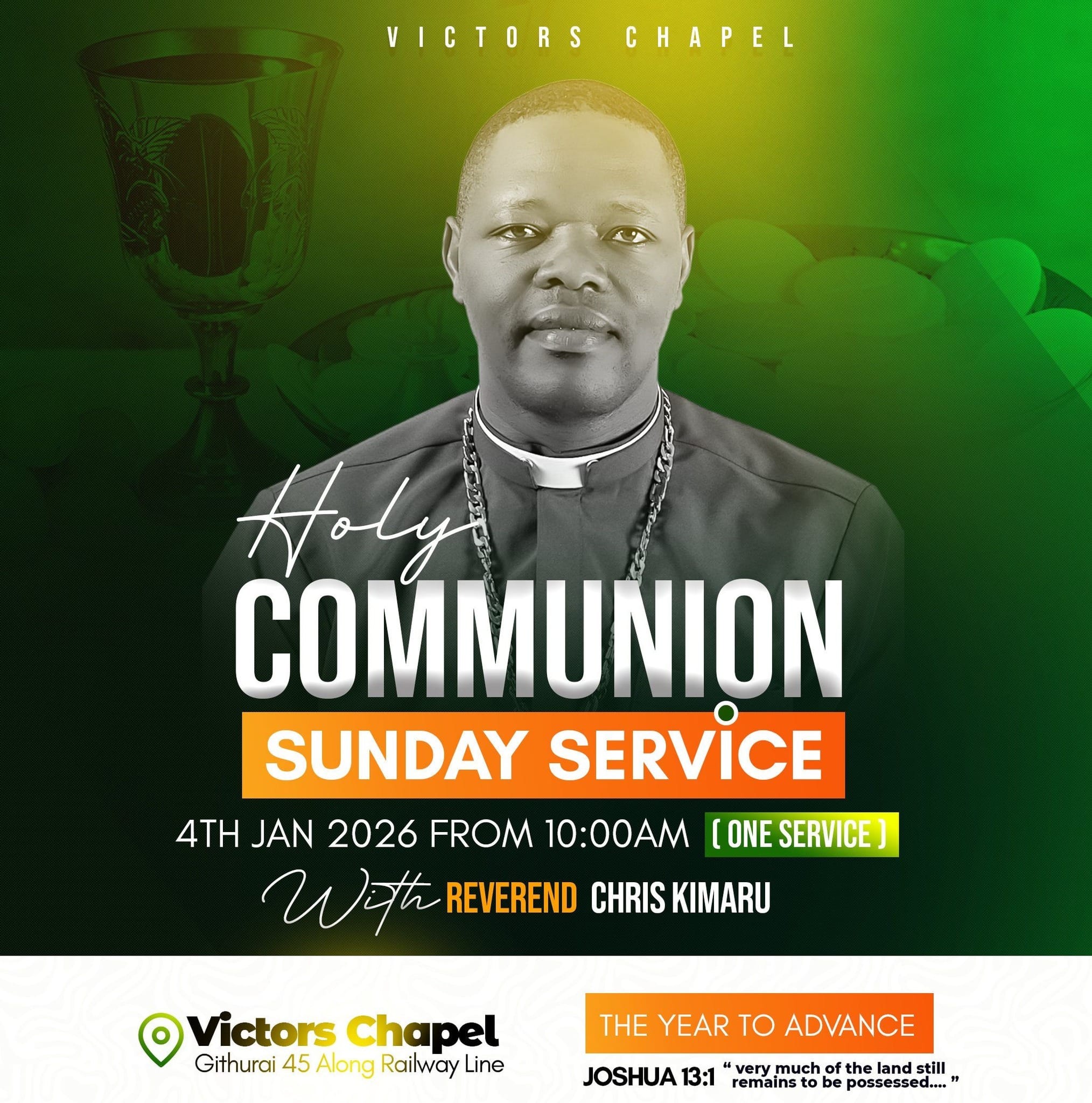You are warmly invited to join us for a Holy Communion Sunday Service at Victors Chapel Githurai 45 on Sunday, 4th January 2026, starting from 10:00 AM. This will be a special service set aside for fellowship, worship, and partaking of Holy Communion as we gather together as a church family at the beginning of the year.