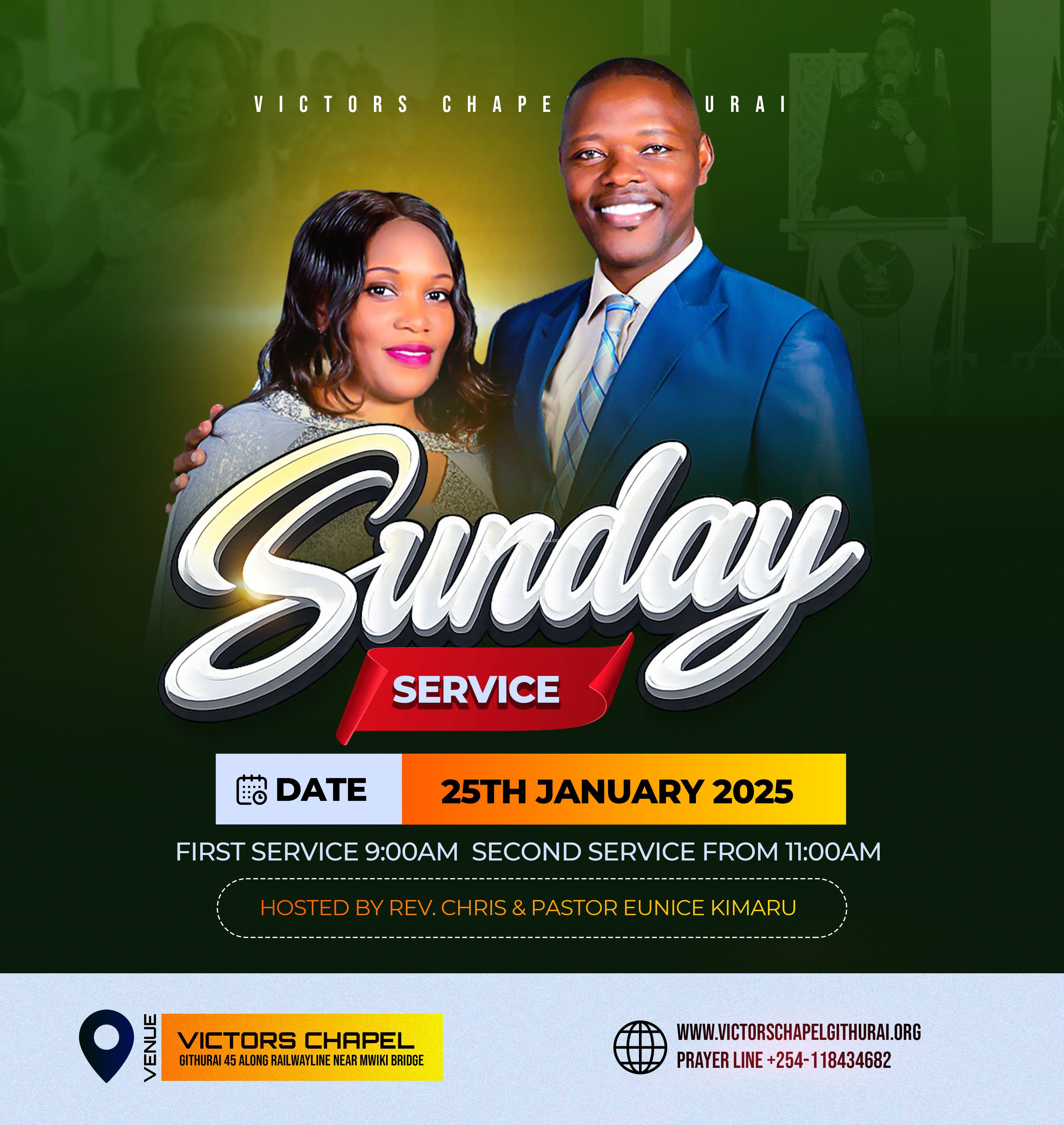 Hey family, this coming Sunday, 25th January 2026, Victors Chapel Githurai is the place to be! Pull through for our powerful Sunday Services as we gather to worship, pray, and hear a fresh word from God with Rev. Chris Kimaru & Pastor Eunice Kimaru. Come expecting fire, healing, and real transformation — the kind that flips victims into victors. Yes we can’t wait to see you.